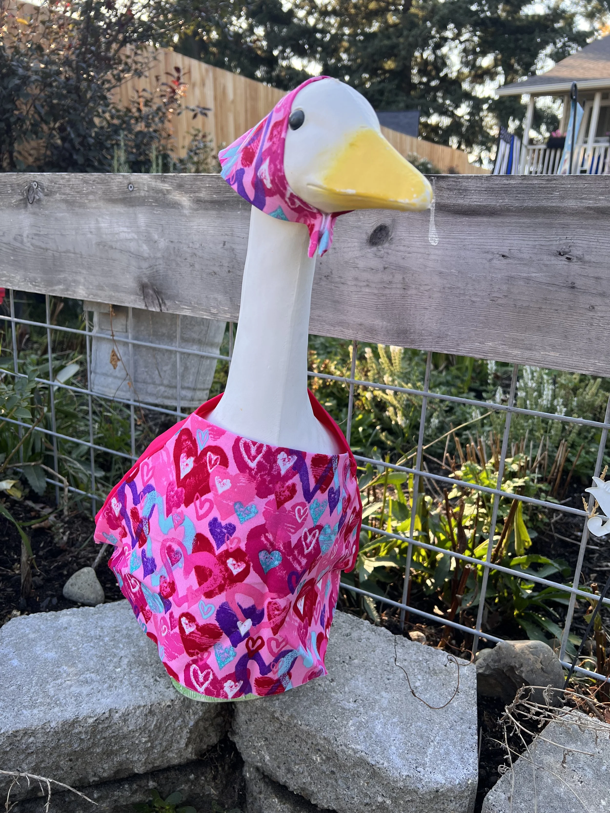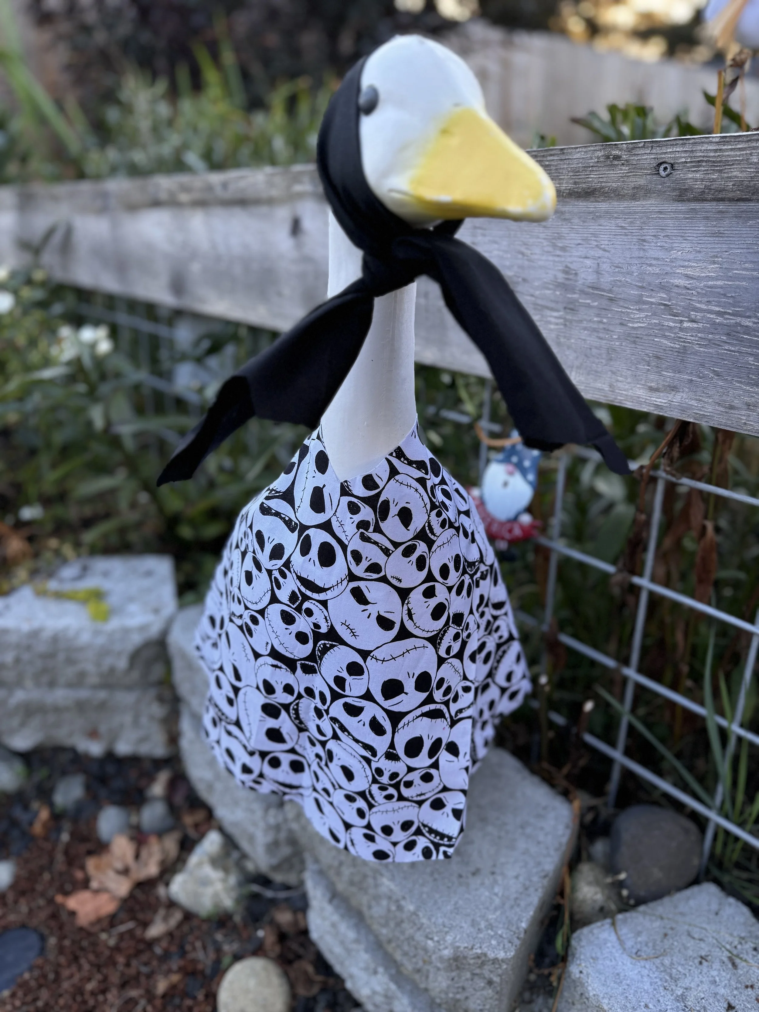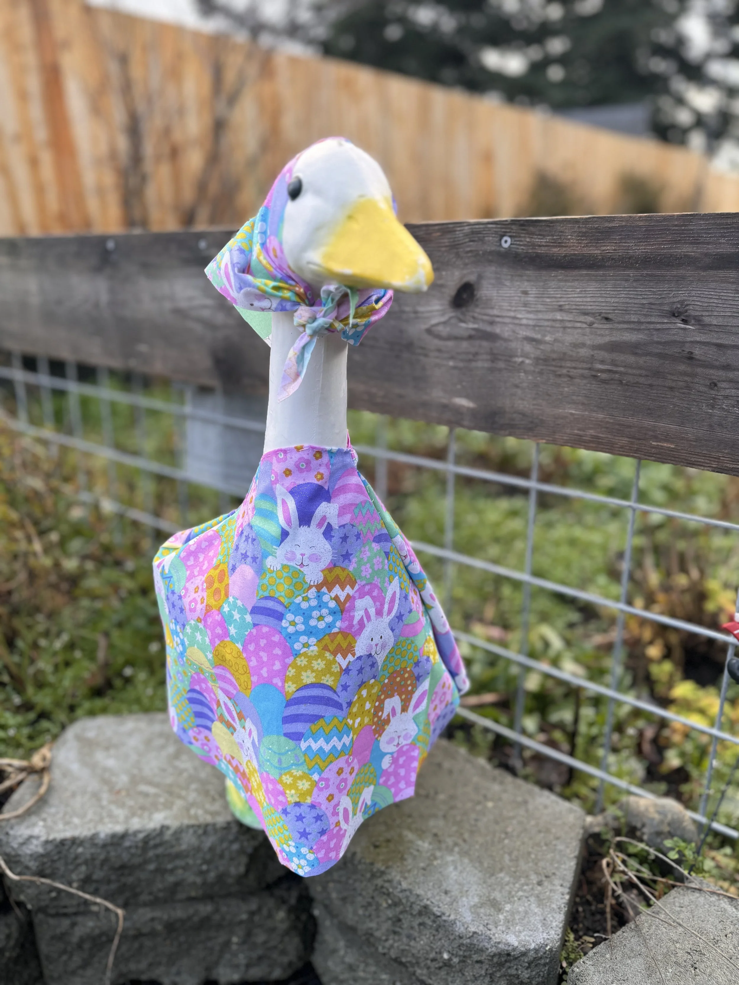 It is exactly what it says, I make custom goose clothing for your porch goose. If there is a material for it I can make it. I absolutely love my goose! She/he loves being a model for the clothing I make. Contact me for more details.